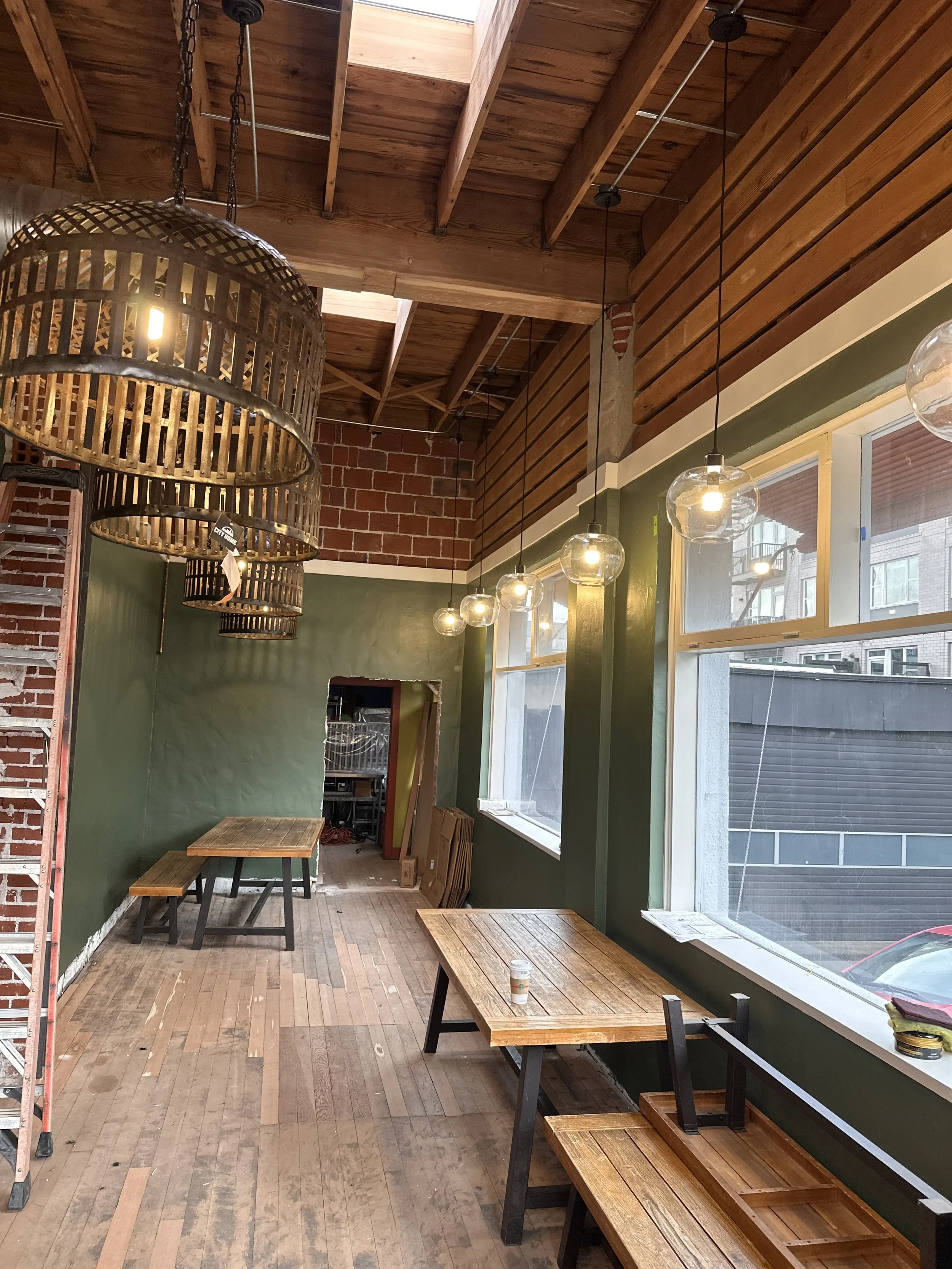 One of the challenges and successes of working in this old historic space was to take a building, that has settled over the years/clearly out of level, and create a clean level line that surrounds the dinning space. This line provided a space for drywall/plaster to finish to create a beautiful up-lit space. This building was severely out of level, the walls were not flat at all so we used out laser level to find the lowest point allowed for our finish detail and then brought everything else up to match.